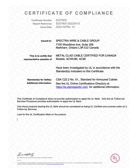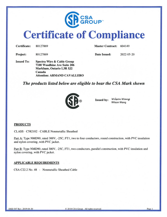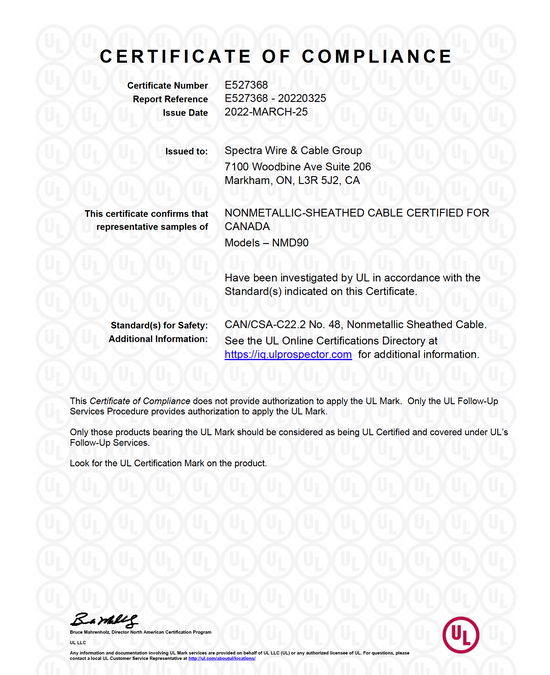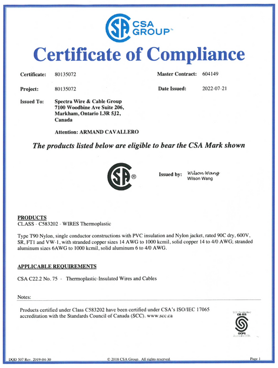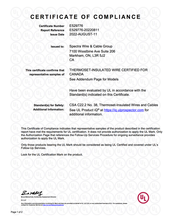 All products distributed by Spectra Wire & Cable Group are CSA or cUL certified. These groups have provided testing, inspection, and certification services for all Spectra Wire and Cable products.
